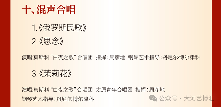 本场音乐会,俄罗斯柴可夫斯基音乐学院“白夜之歌”合唱团用汉语演绎的金巍作品,将世界顶级合唱音响与绝美中国合唱语言的融合共鸣,完美诠释了金巍作品的多元文化神韵。两国合唱团丰富的层次感和情感表达,将音乐会引向一个更新的审美层阶。