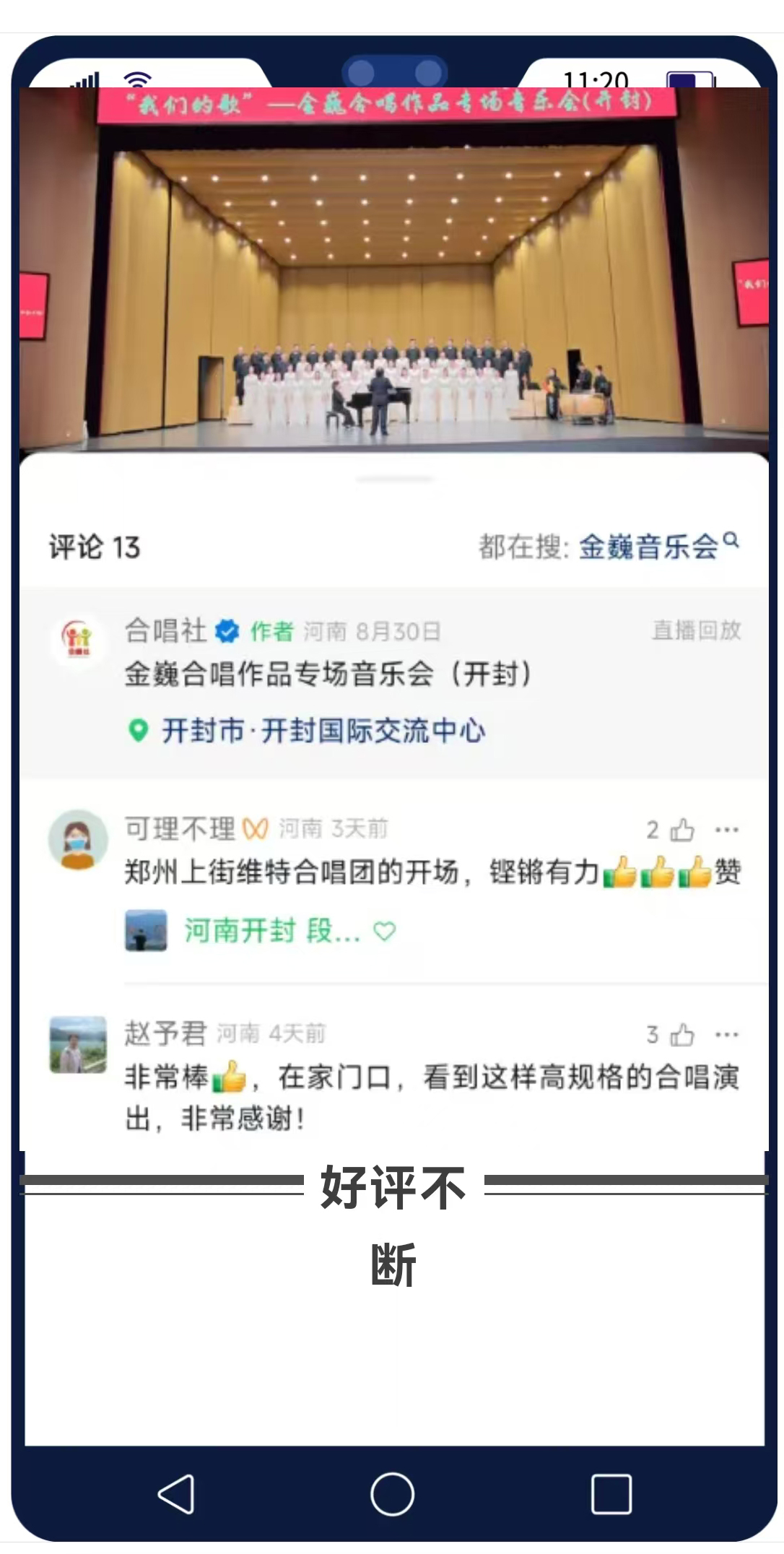 观众段女士感慨:“没想到合唱能将古典诗词演绎得如此动人,尤其是《如梦令、常记溪亭日暮》的改编,让人仿佛穿越回盛唐。”音乐会还通过“合唱社”平台同步直播,吸引超过1.5万名网友在线观看,评论区被“经典永流传”“开封文化新名片”等留言刷屏。