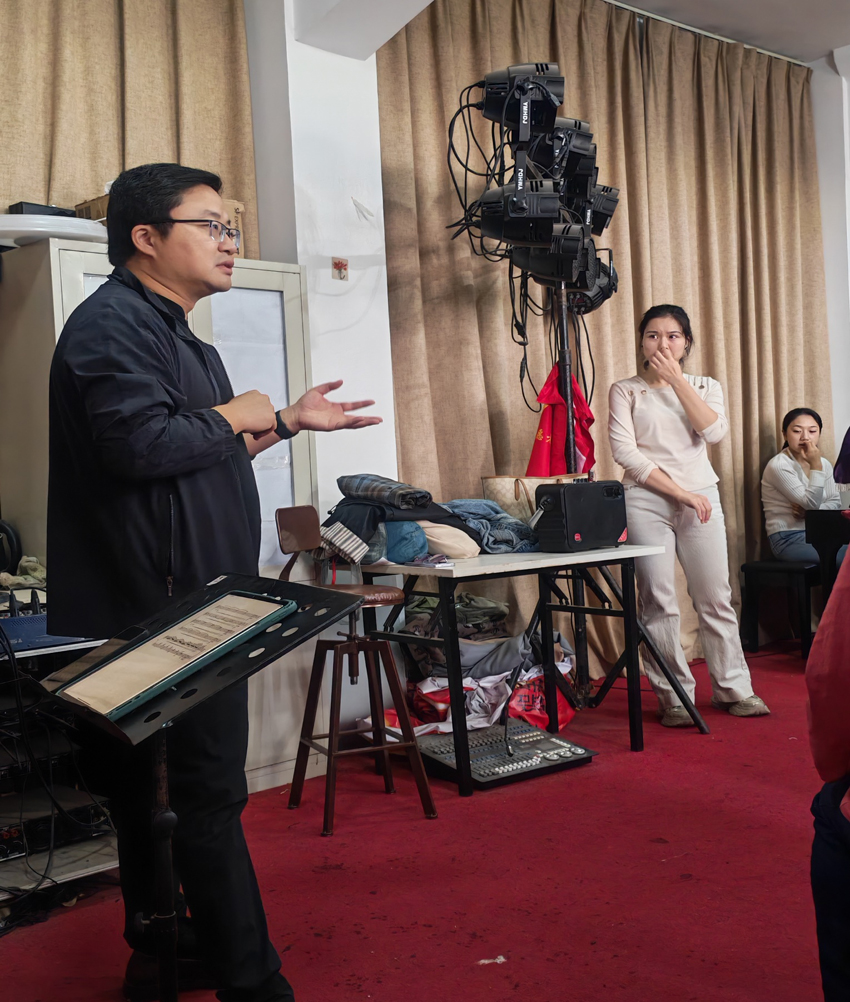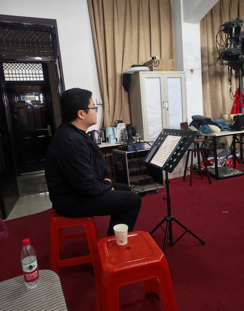 针对该团的排练袁副教授开出了“三剂药方”:①利用“大句子”练习引导情绪进入作品意境;②利用良好的对音技术提升排练效率;③注重咬字的变化,咬字要为音色服务。咬字的变化方法有很多,在应用中你不妨稍微改变一下,哪一种表情的方案有利于音色的形成,就得先选用哪一个;不要一直纠结这种感觉韵味强,韵味是强了声音没了,不要孤芳自赏,我们目的是把声音送到台下的评委和观众席上。