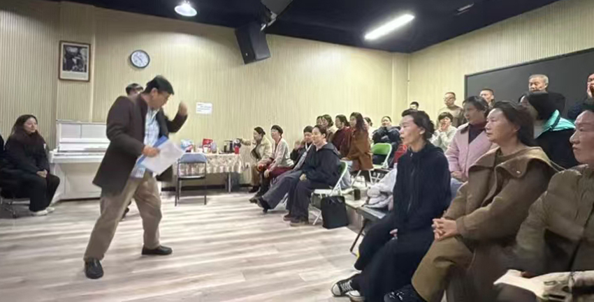 李俊生教授以风趣幽默的教学风格,将专业乐理知识转化为通俗实操技巧,从咬字归音的精准度到乐句情感的递进,从指挥手势的默契配合到舞台状态的自然呈现,倾囊相授宝贵经验。他特别强调民歌的本土化表达,鼓励团员融入地域文化的质朴与豪迈,让作品既有专业水准又饱含情感温度。结合新年音乐会“运河之光,时代歌扬”的主题,他还就曲目编排的节奏衔接、高潮段落的张力营造给出针对性建议,助力合唱团深化“运河湾之光”的时代内涵诠释。