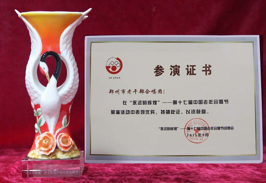 9月4日晚,为期三天的“永远的辉煌”——第十七届中国老年合唱节在黑龙江省齐齐哈尔市落下帷幕。本届合唱节由文化部主办,黑龙江省文化厅、齐齐哈尔市人民政府和中国合唱协会承办。来自全国25个省区市的46支老年合唱团2000多名团员齐聚鹤城交流展演,展现了老年人丰富多彩的文化生活、充满朝气的精神风貌和高超的合唱技巧。受河南省文化厅、河南省合唱协会推荐,郑州市老干部合唱团代表河南省出赛获奖,并被组委会选定作为六个优秀合唱团之一参加了本届合唱节的闭幕式演出,为河南人民争了光。