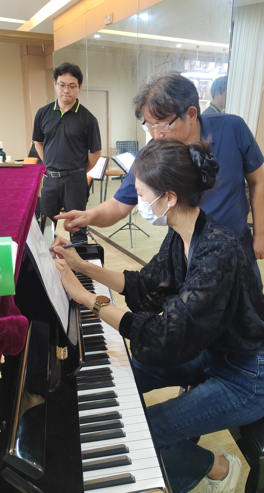 对于《大江东去》,周教授认为作品对历史过往的磅礴叙事,始于脚下的小小浪花。因此钢琴各个声部要柔和并完全融合。之后,又着重教授团员们对高音的处理:高音需要“站”在高位,而非“冲”上去;我们需要“先搭架子,再晾衣服”。语言生动形象,深入浅出。