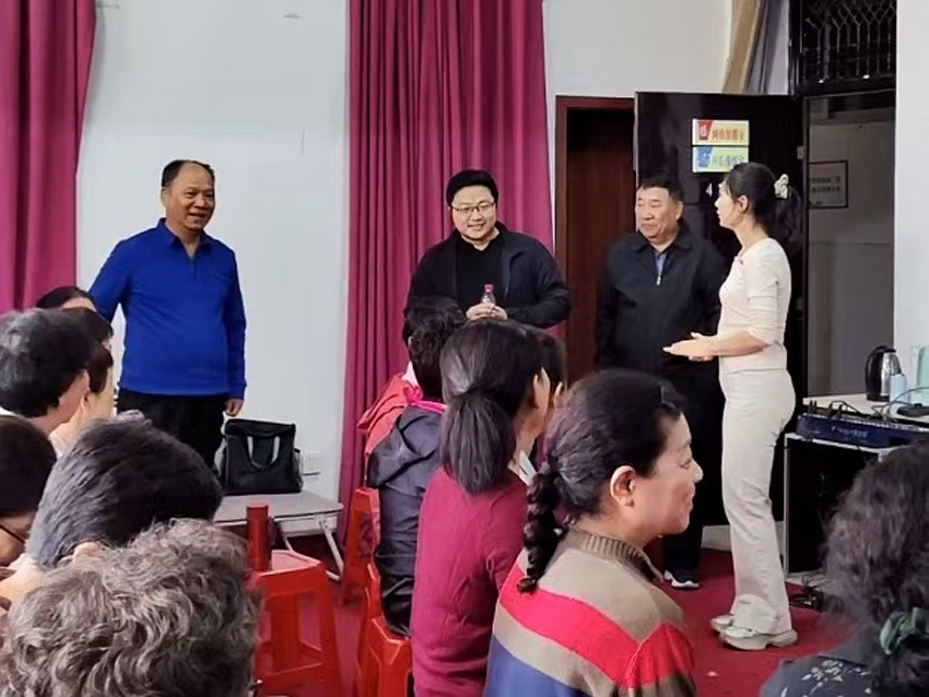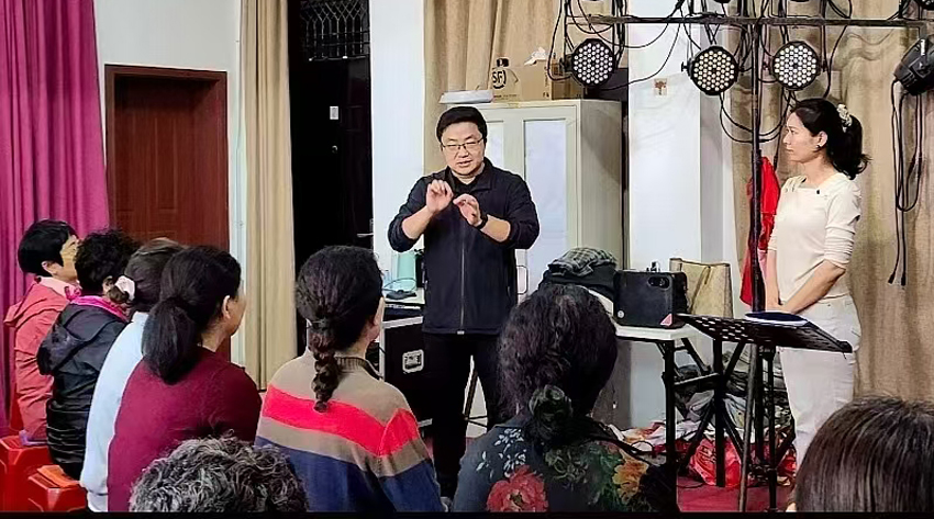 排练现场袁副教授聆听了该团参赛的两首作品《太行山新编》、《康定情歌》。针对该团的演唱,他从专业角度对歌曲的情感理解与声音强弱处理、声部融合、音准节奏的把握、进声与收声的技巧均进行了深入浅出的剖析与细致指导。