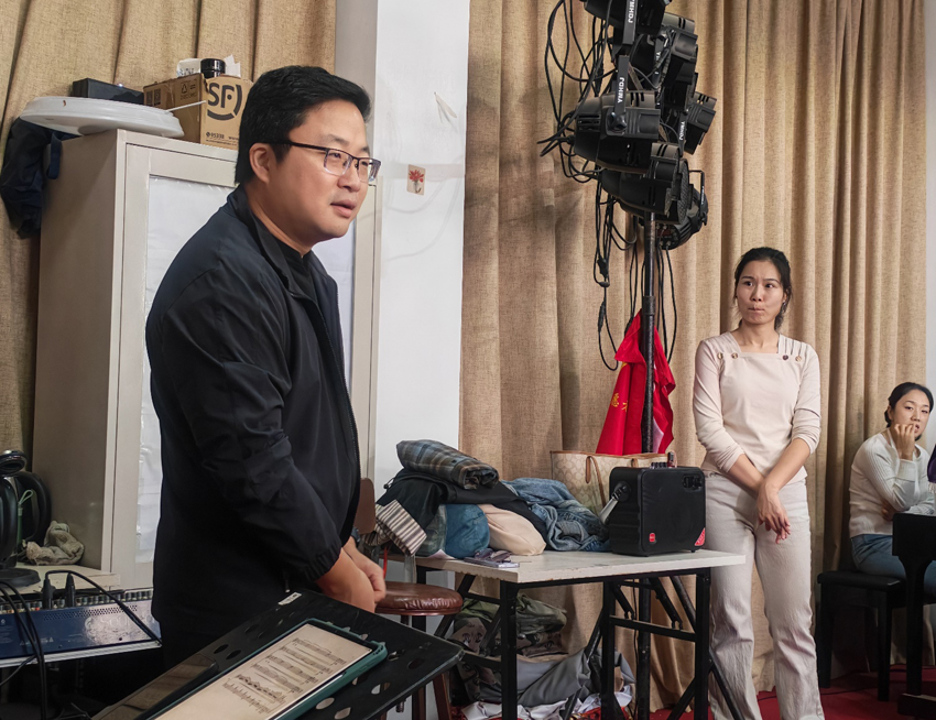 针对该团的排练袁副教授开出了“三剂药方”:①利用“大句子”练习引导情绪进入作品意境;②利用良好的对音技术提升排练效率;③注重咬字的变化,咬字要为音色服务。咬字的变化方法有很多,在应用中你不妨稍微改变一下,哪一种表情的方案有利于音色的形成,就得先选用哪一个;不要一直纠结这种感觉韵味强,韵味是强了声音没了,不要孤芳自赏,我们目的是把声音送到台下的评委和观众席上。