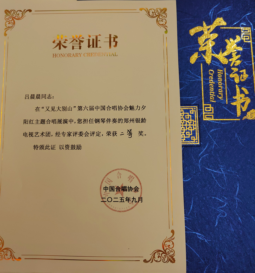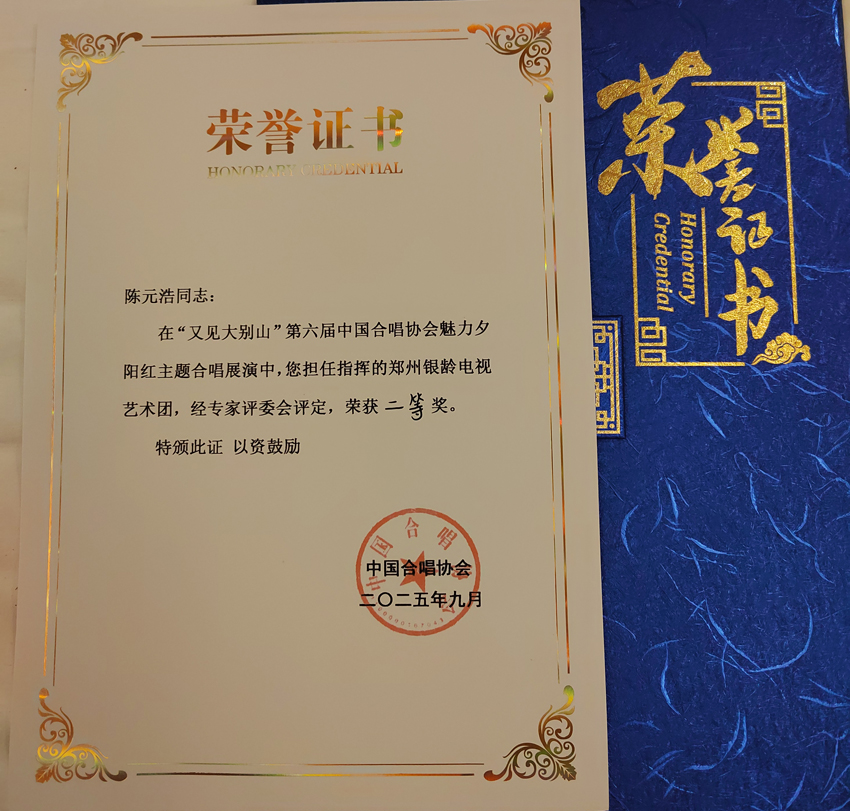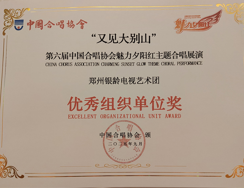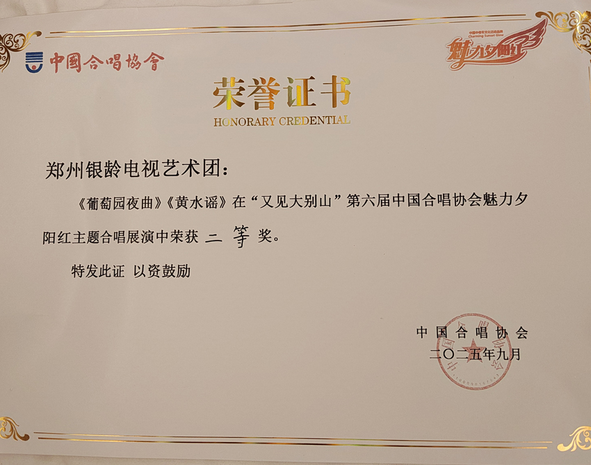 2025年9月25日“又见大别山”第六届中国合唱协会魅力夕阳红主体合唱展演在武汉琴台音乐厅隆重举行。郑州银龄电视艺术团带着“葡萄园夜曲”和“黄水谣”两首作品参演,博得全场掌声。经过激烈角逐,从近九十支队伍中脱颖而出,荣获了二等奖。