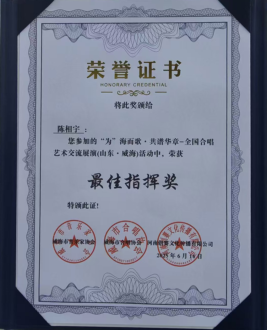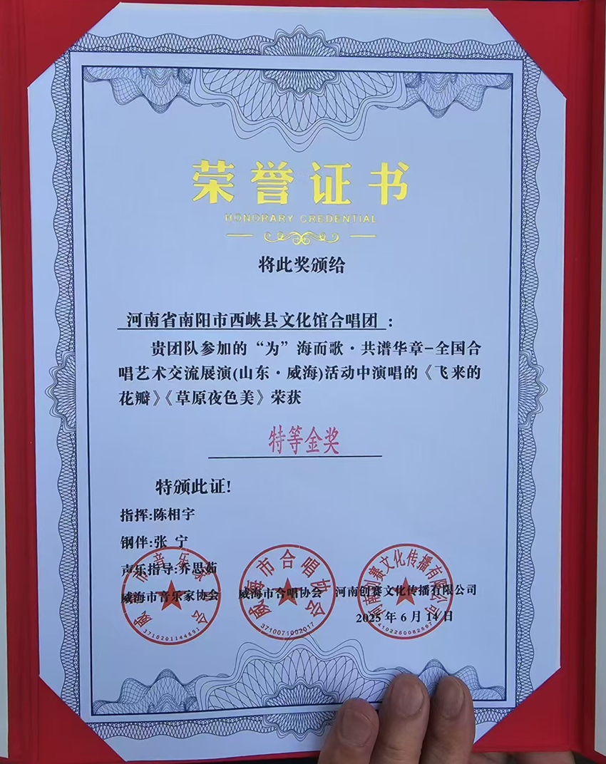 2025年6月14日,南阳市西峡县文化馆合唱团作为河南省唯一参赛团队参加了山东威海举办的《“为”海而歌.共谱华章》合唱比赛。经过半年的厉兵秣马,千里跋涉,奔赴参赛,一鼓作气,以优美的混声合唱《飞来的花瓣》和无伴奏混声合唱《草原夜色美》一举征服评委和全场观众,夺得参赛19支队伍的特等金奖和最佳指挥奖,最佳钢琴伴奏奖三项大奖!