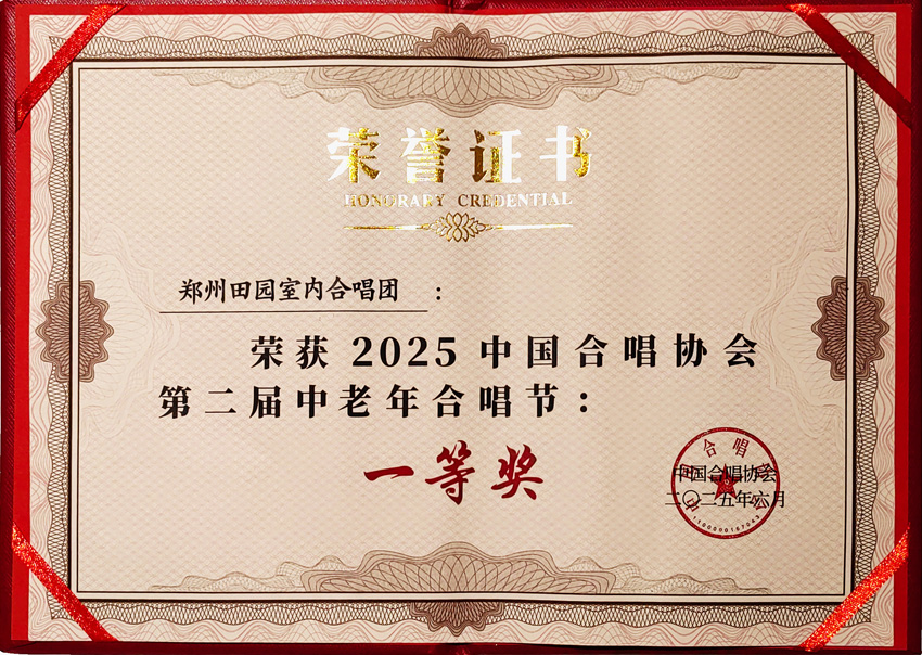 6月16日-20日,由中国合唱协会主办的2025第二届中老年合唱节在安徽省黄山市隆重举行,来自全国各地的47支优秀合唱团齐聚在险峻秀美的黄山脚下。在这次由中国合唱协会主办的高规格合唱比赛中,郑州田园室内合唱团演绎了《踏莎行.雪似梅花》、《世纪春雨》两首合唱作品,他们凭借精湛细腻的演唱技巧和高质量的艺术表现力,在演唱中时而以景抒情似时空穿越,时而欢快自信如春风化雨,把两部风格迥异作品的内涵演绎的美轮美奂,赢得了现场观众的和评委们的高度好评,荣获2025第二届中老年合唱节比赛一等奖,不仅为我省合唱界争得了荣誉,同时也为郑州田园室内合唱团今后向合唱艺术更高层次的迈进和发展奠定了坚实的基础。