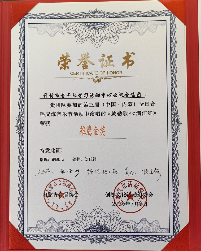 开封市老干部学习活动中心云帆合唱团在合唱节上演绎了《敕勒歌》、《满江红》两首风格迥异的合唱作品,喜获金奖第一名,同时获得“优秀组织奖”“优秀指挥奖”“优秀伴奏奖”。
